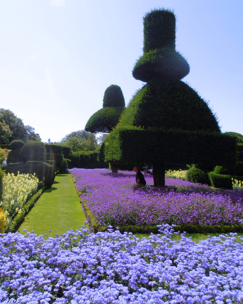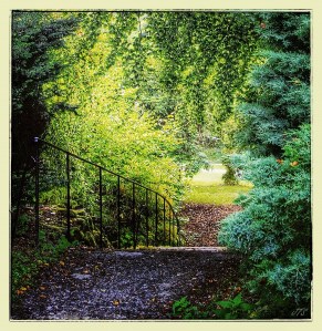 I hear voices and look skyward. The light through the leaves streams yellow into my vision. I squint, the hiss of the rain has stopped. I hear birds and movement from a subtle breeze waffling the greenery. The path I came along is adjacent to a banking of terraced trees. In the darkness it looked dense and dark. In the skimming light I can now see the boarder of the trees at a high level.
