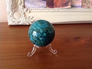 Onto the Crystal of the Month. I purchased this lovely from Philip Permutt, The Crystal Healer. It is a Chrysocolla ball. It is known as the stone of communication. It has a wonderful quality for clarity to be realised and wisdom to be expressed. It has a healing and harmonious energy which alleviates nervousness and creates serenity. I was looking for a crystal that would resonate with an image of wholeness and connection for Distance Reiki. I think I found it. I love that Chrysocolla not only has a great connection for communication but to me it looks like Planet Earth.